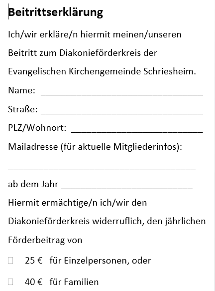 Der Diakonieförderkreis lebt davon, dass möglichst viele Menschen durch finanzielles oder persönliches Engagement dazu beitragen, Solidarität und gegenseitige Hilfe zu ermöglichen. Sie tragen dazu bei, dass Menschen in Not im Geist der christlichen Nächstenliebe ganzheitliche Hilfe erfahren. Der Mitgliedsbeitrag ist steuerlich als Spende abzugsfähig.
